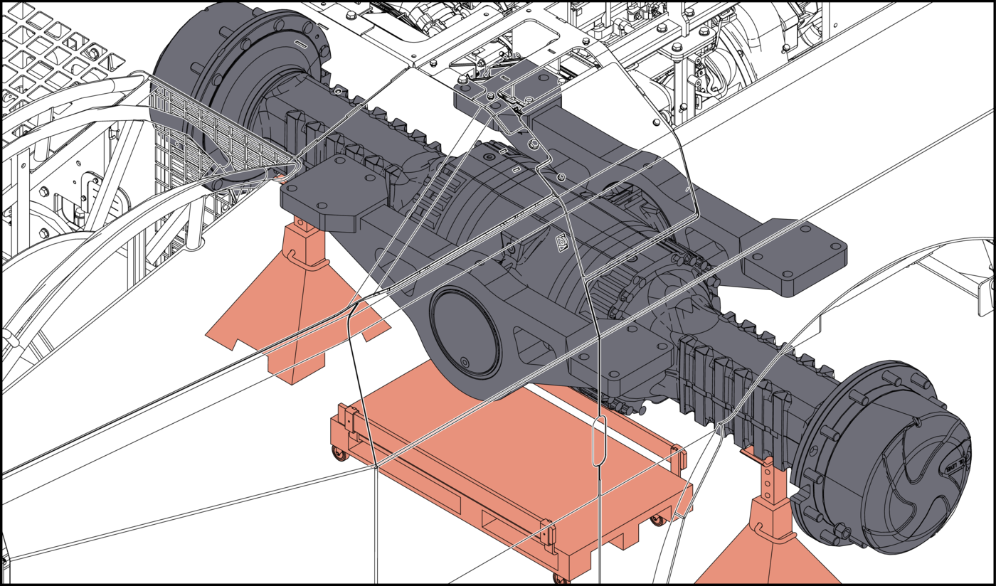 - 5.Lower the rear axle onto the workshop dolly with the attached lifting device.