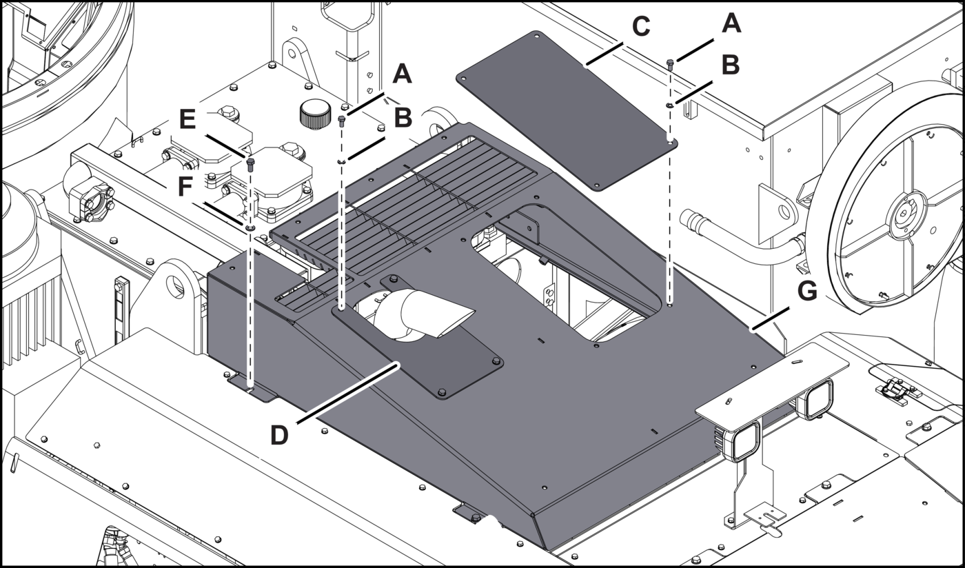 - Alternative stepFor Boltec M, Boomer M1D,Simba M6C, Simba E7C, and Cabletec M Machine: Remove the screws (Figure 8A, item B) and washers (item A) that attach the plate (item C) to the engine hood. Discard the hardware.