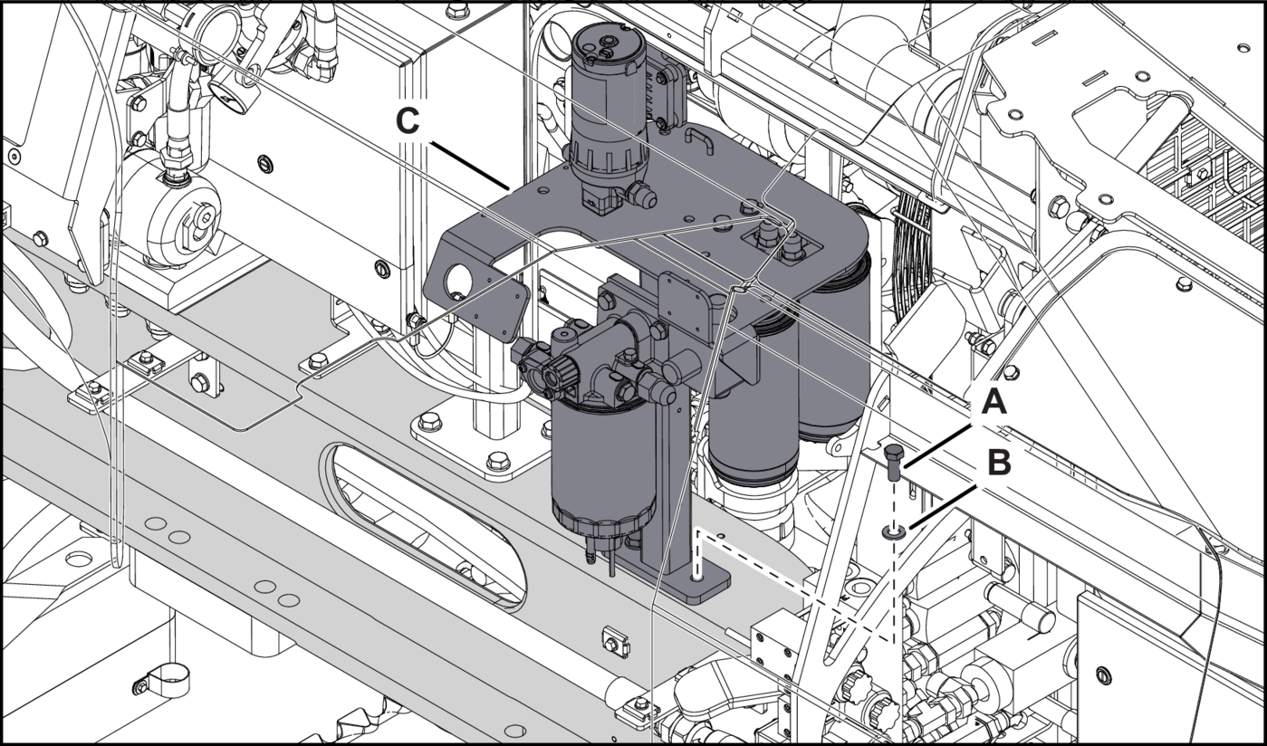 Install the washers (item B) and insert the screws (item A) to attach the attachment (item C) along with the filters to the engine frame.