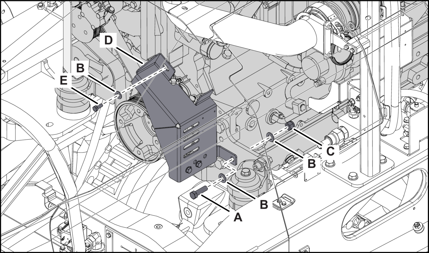 For Boltec M, Cabletec M, Boomer M1 D, Simba E7 C, M6 C Machine: Install the washers (items B and D) and insert the screws (items A and E) to attach the upper cover (item C) to the engine.