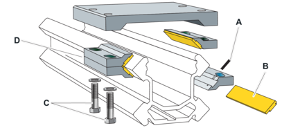 Each slide piece (B) is kept in place by keys (A).