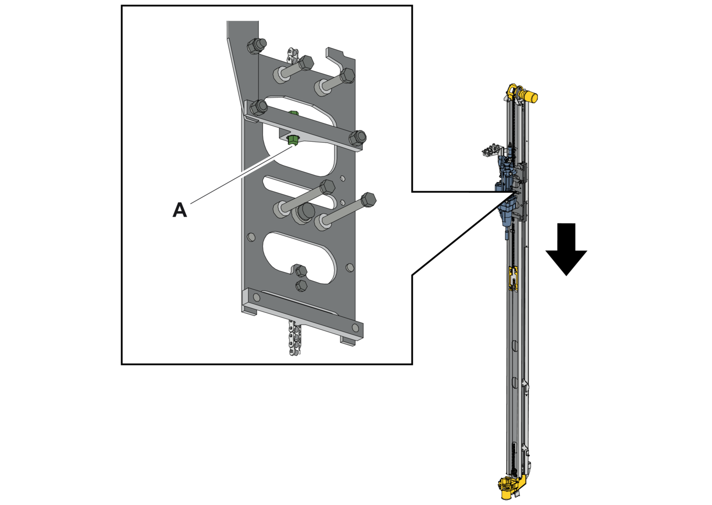 - 1.Check mounting and direction on the drill rod support attachment (A).