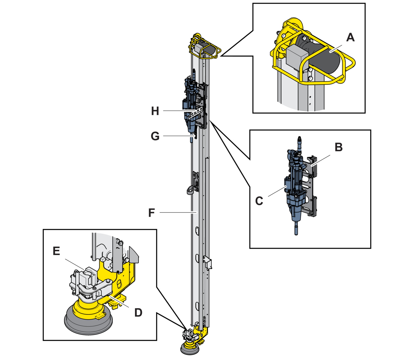 - 4.Check clearance, mounting, damage, and tightening torque on the slide rails (B). Maximum clearance 2–4 mm (0.08 - 0.16 in.) . See also maintenance instructions for adjustment directions.
