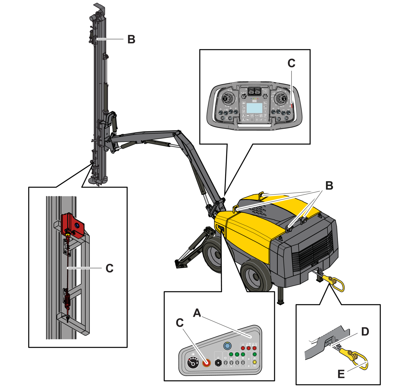 - 3.Check that each emergency stop (C) stops the engine when activated. Before checking the next emergency stop, the previous emergency stop must be reset.