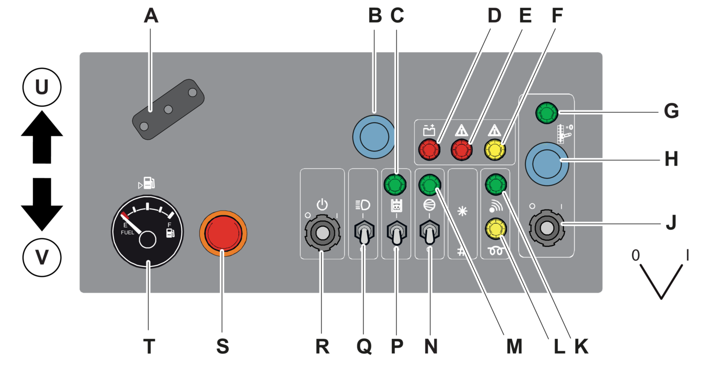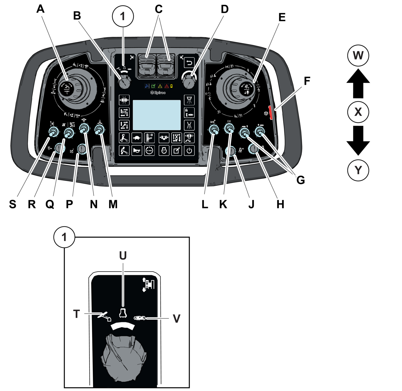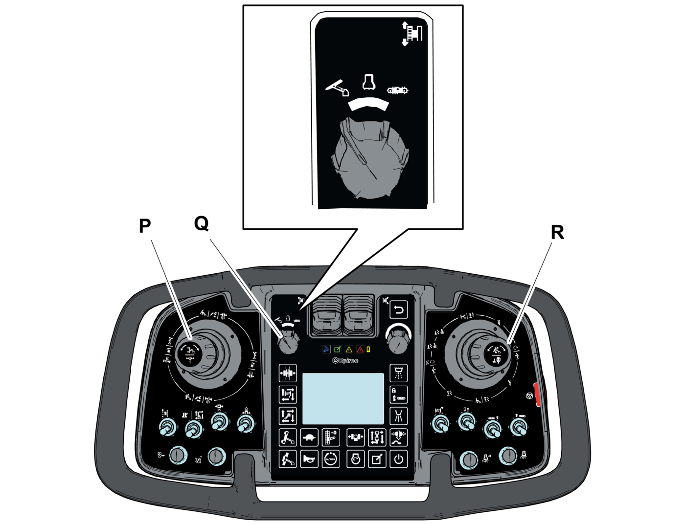 , the left multi-function lever (P) and the right multi-function lever (R) deactivates after 5 seconds of inactivity. The function stop drilling or rotation works regardless of the mode selection of the mode switch (Q).