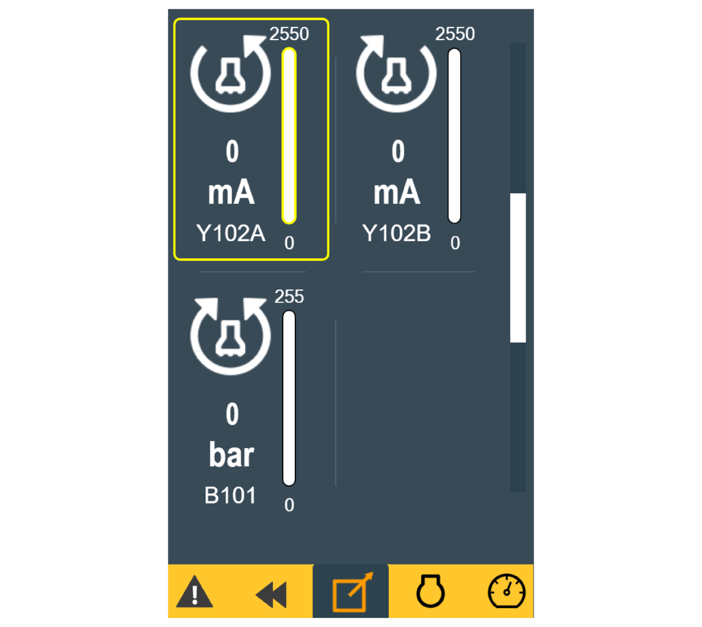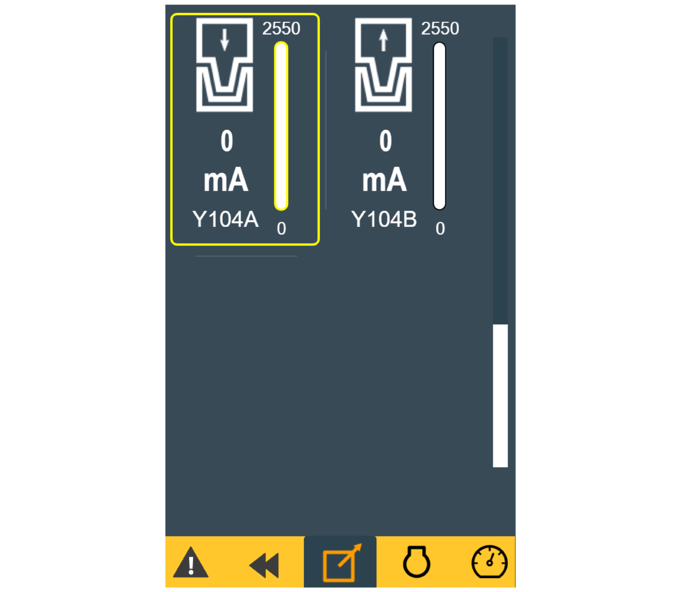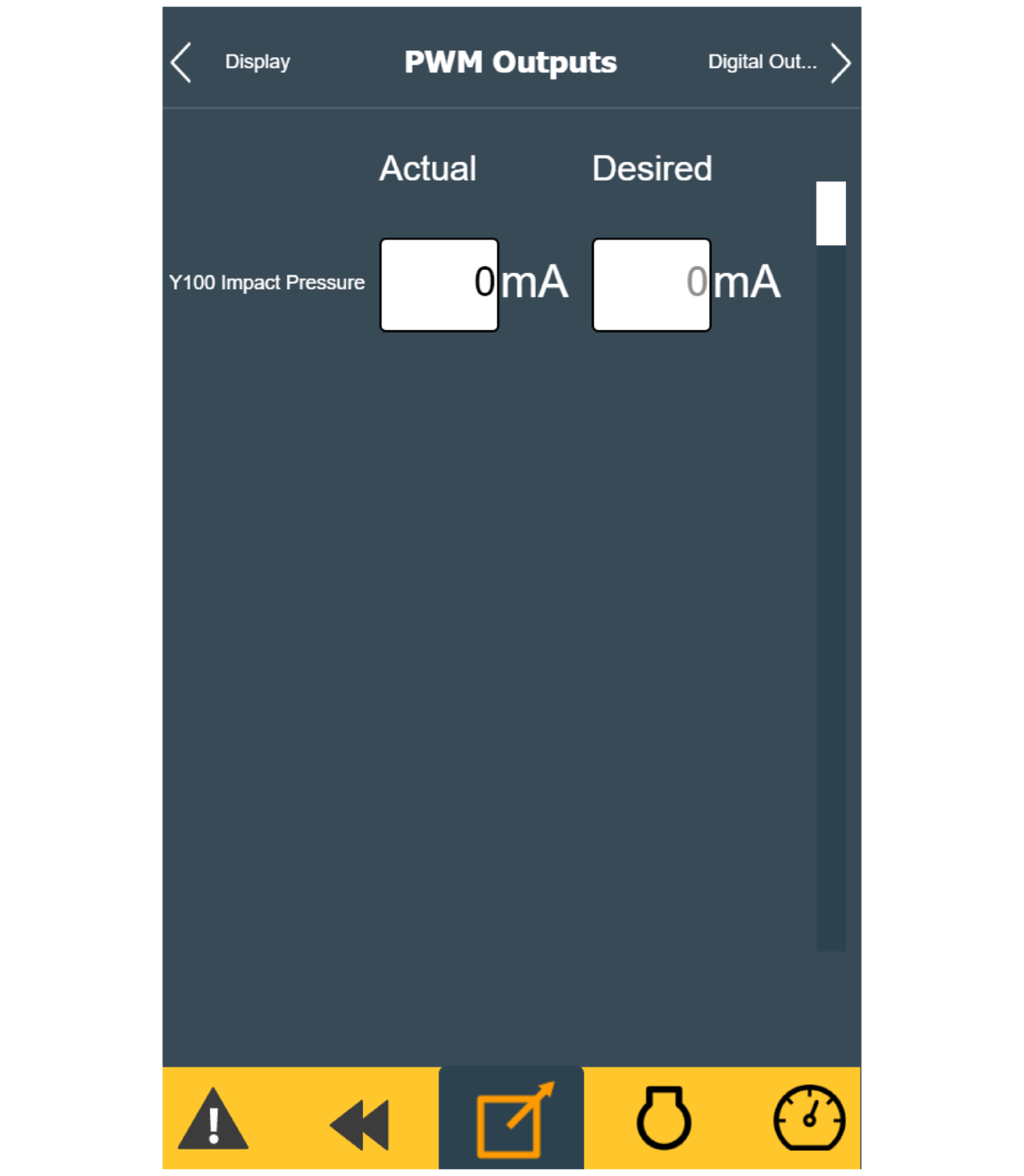 Under PWM Outputs menu, user can read Actual and Desired valve actuation. If a fault is detected in the valve in question, it is indicated with the red box around the actual value and is also shown in the Error messages menu.