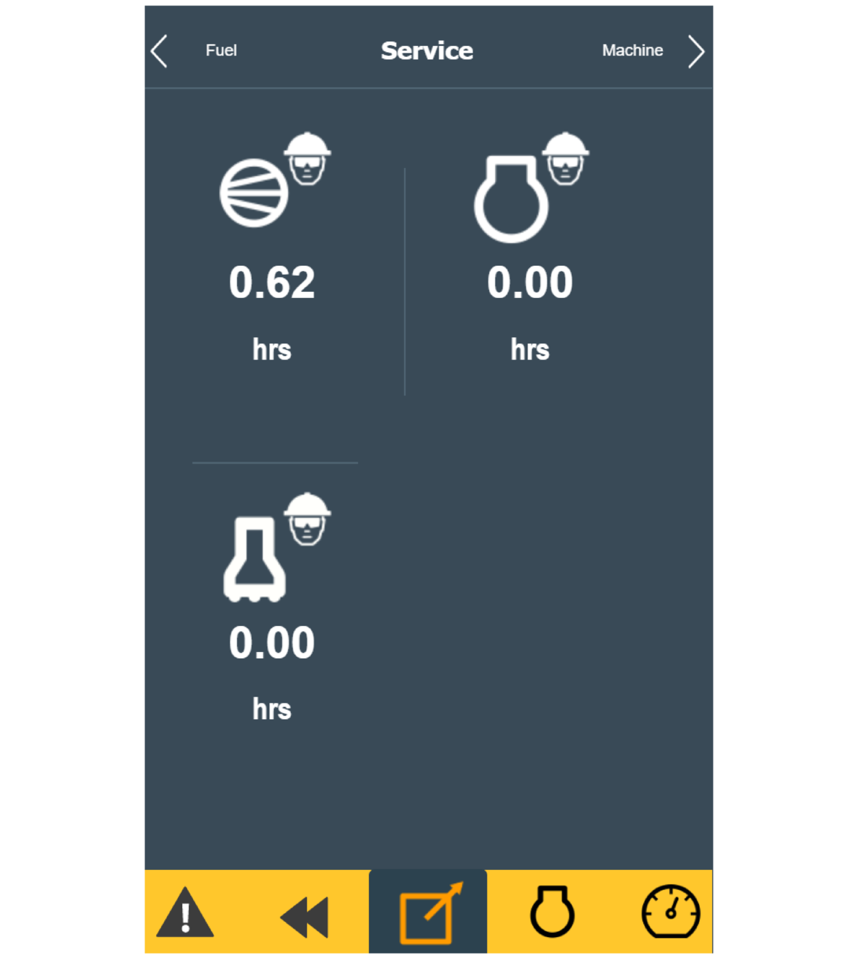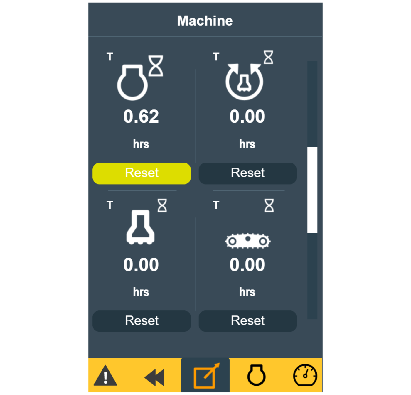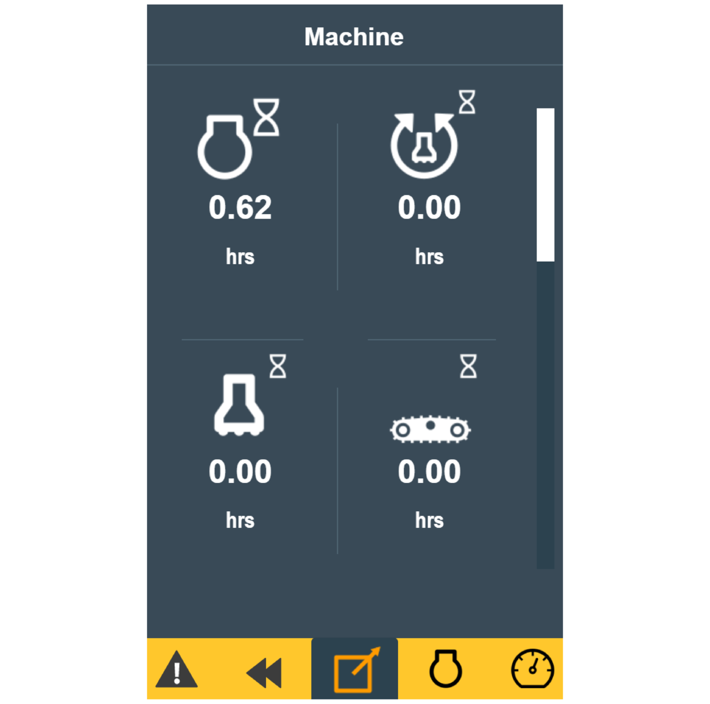 In the Machine menu, the user can read the accumulated hour counters for the machine and the following settings can be made: