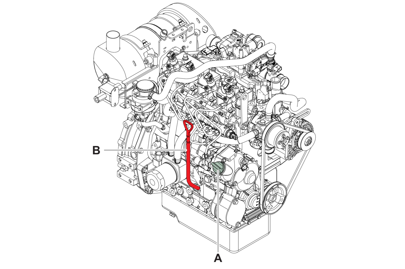 - 1.Check that the oil level is between the upper and lower mark on the dipstick (B).