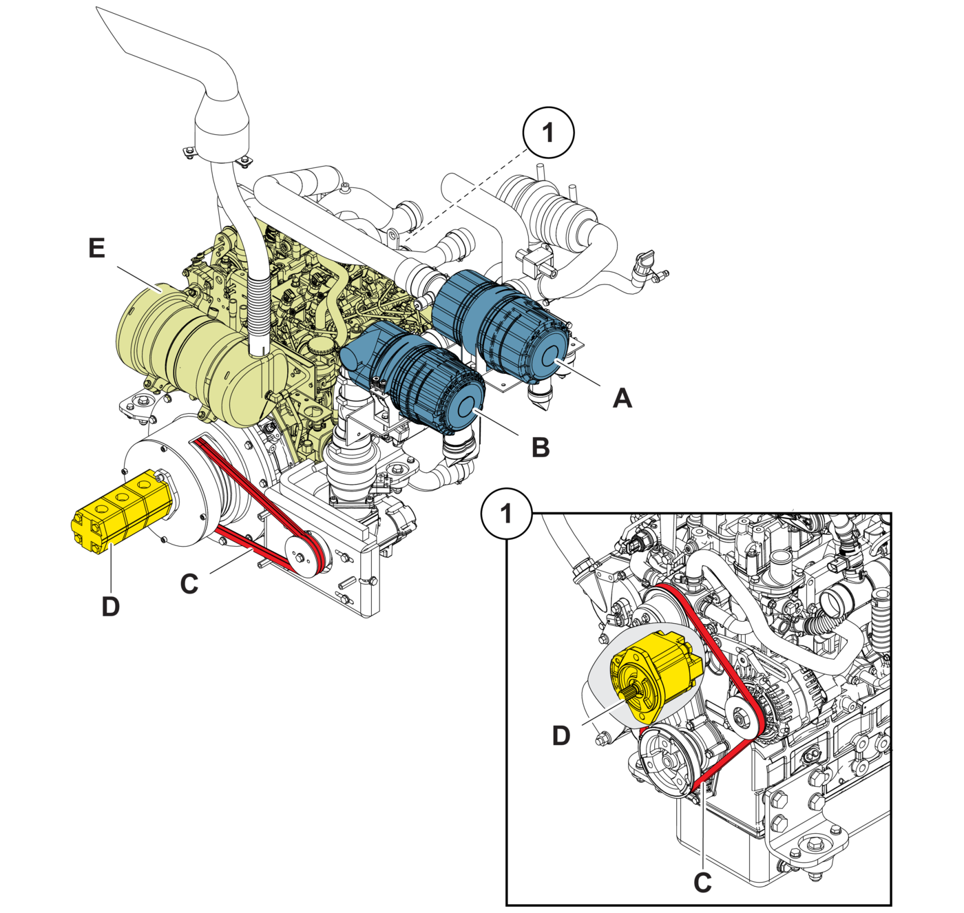 - 1.Check for signs of leakage on the hydraulic oil pumps (D).
