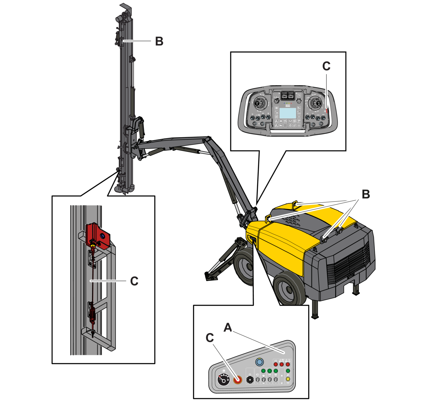 - 3.Check each emergency stop button (C) individually. The previous emergency stop must be reset before checking the next one.