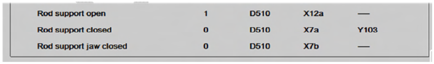 The pipe support is in the open position, the jaws are open (when the proximity switch is energized the RCS shows 1 and inactive as 0).