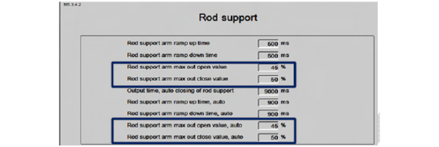 Pipe support speed is controlled indirectly by the percentage adjustments. If the percentage is too low, the pipe support does not move. If the percentage is too high, the pipe support closes fast and slams into the mast.