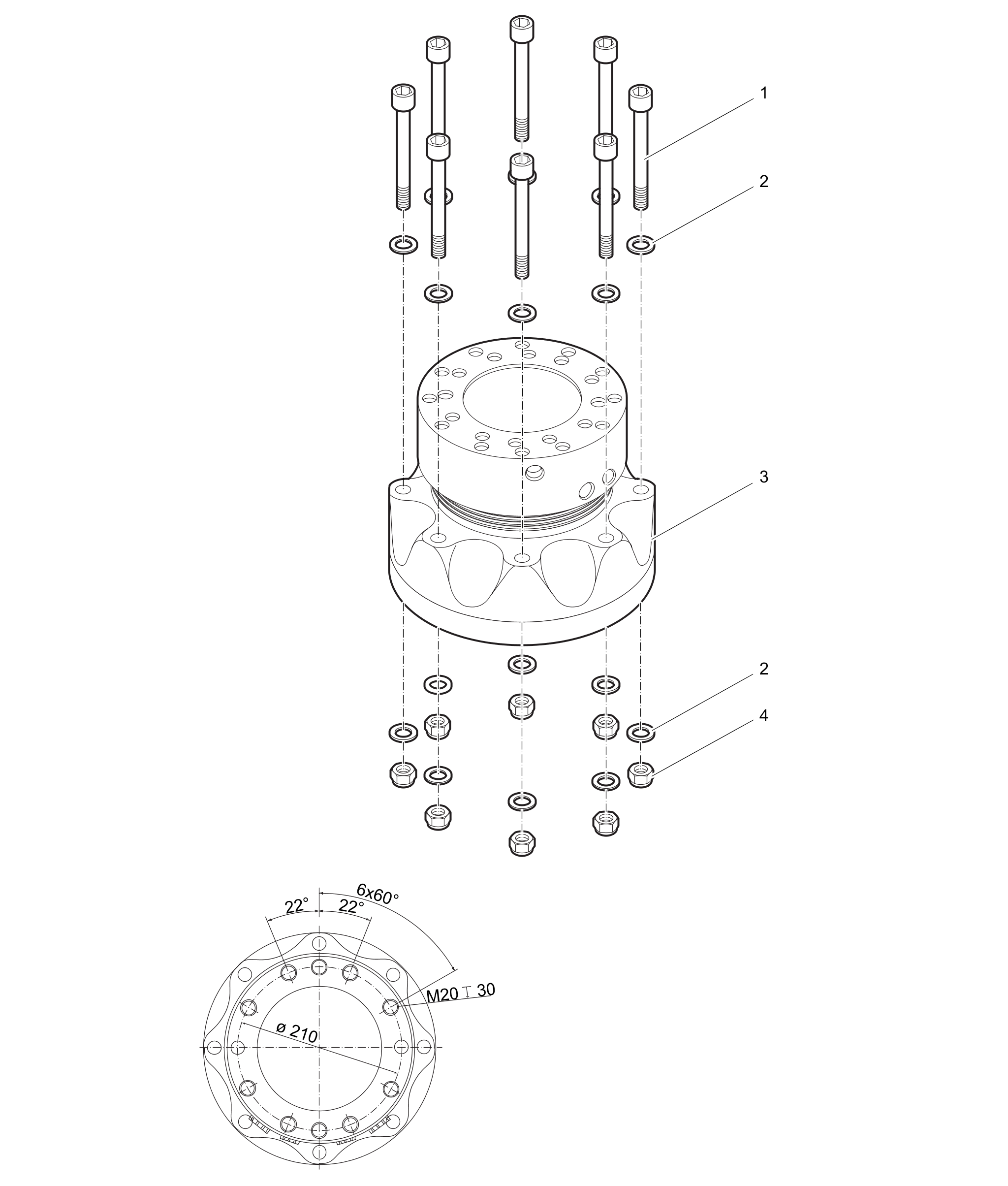 | - | Hexagonal nut | 8 | Spanner size 14/24 mm, tightening torque 295 Nm (218 ft lbf)This document contains no safety instructions. For information on operating, servicing or repairing, the relevant Safety and operating instructions must be consulted at all costs. Please observe the safety instructions listed in the relevant Safety and operating instructions. |